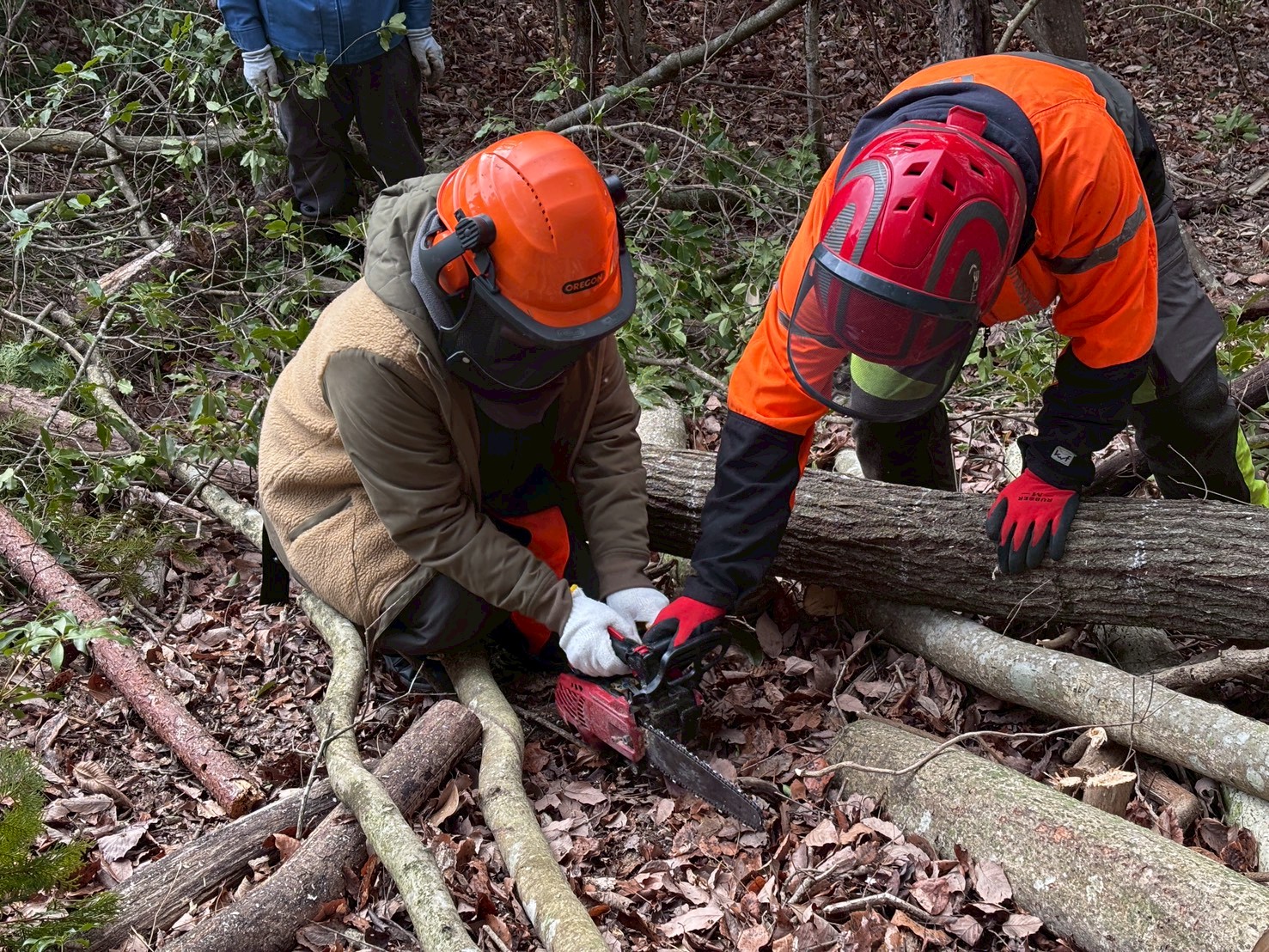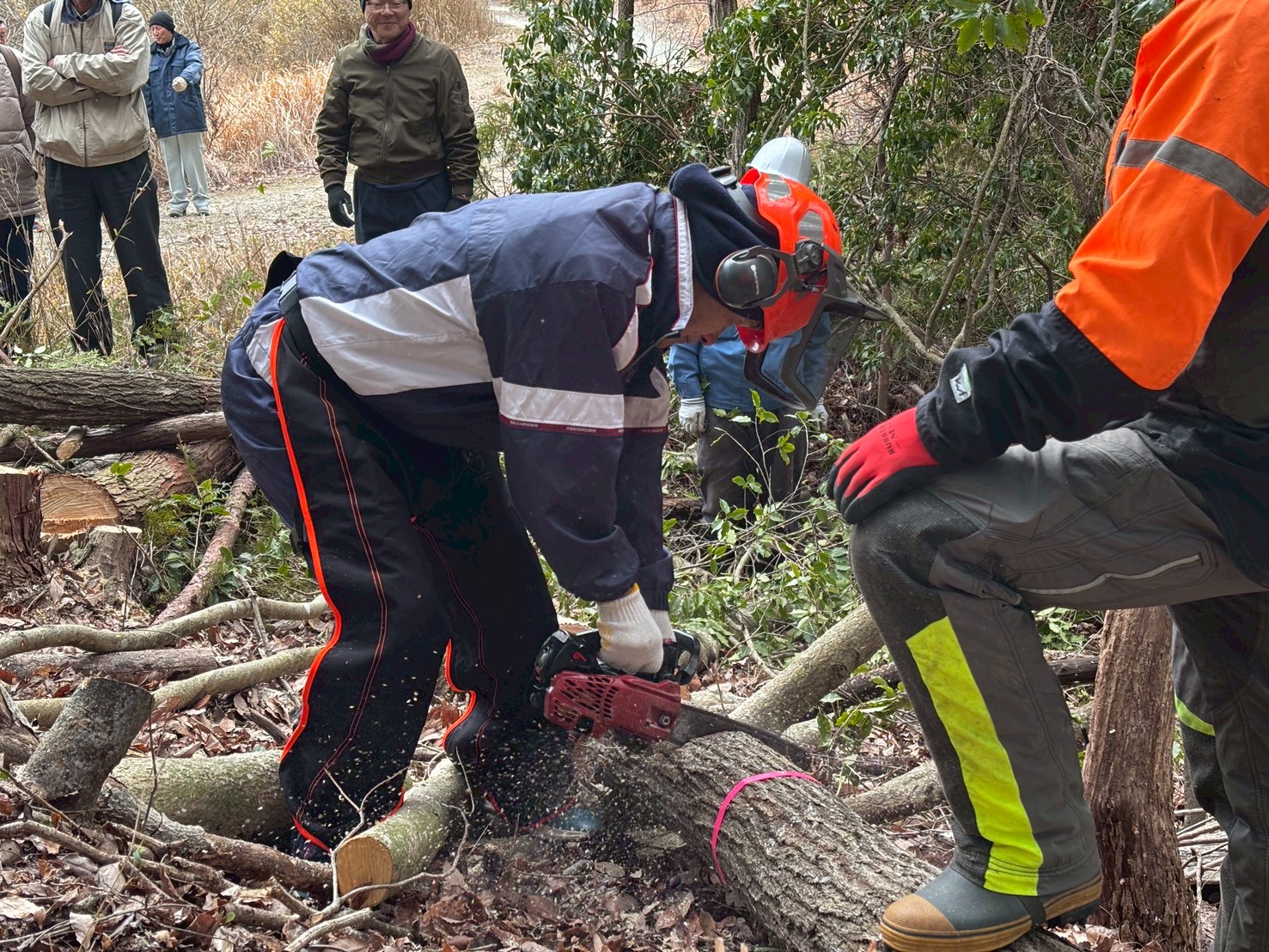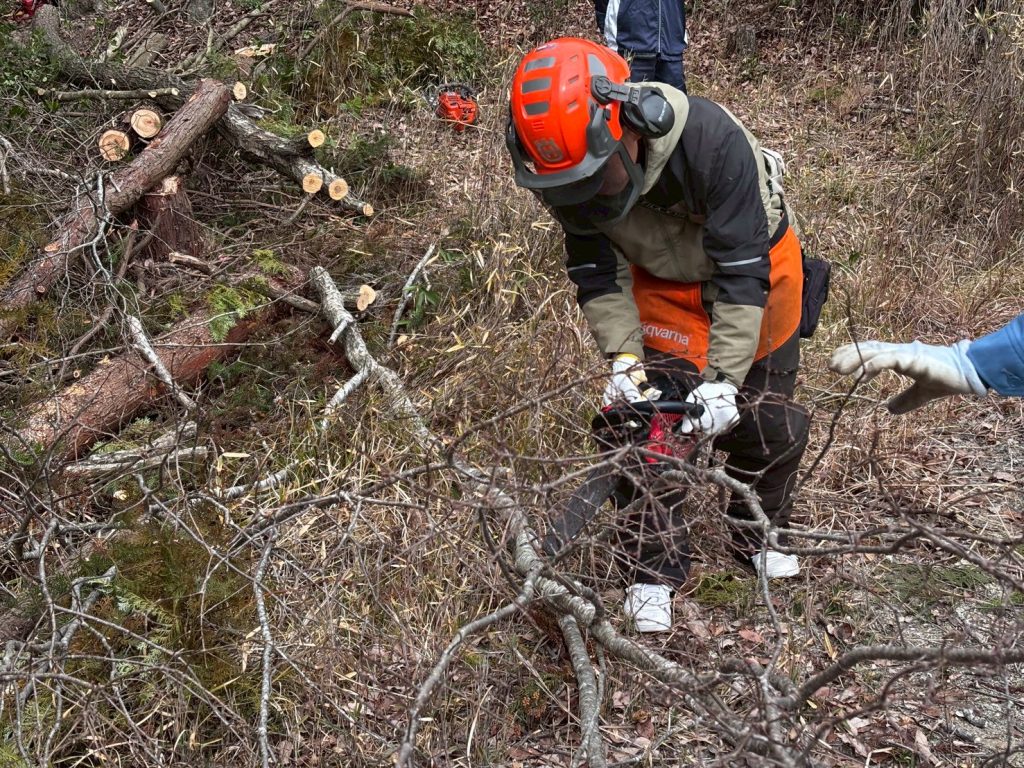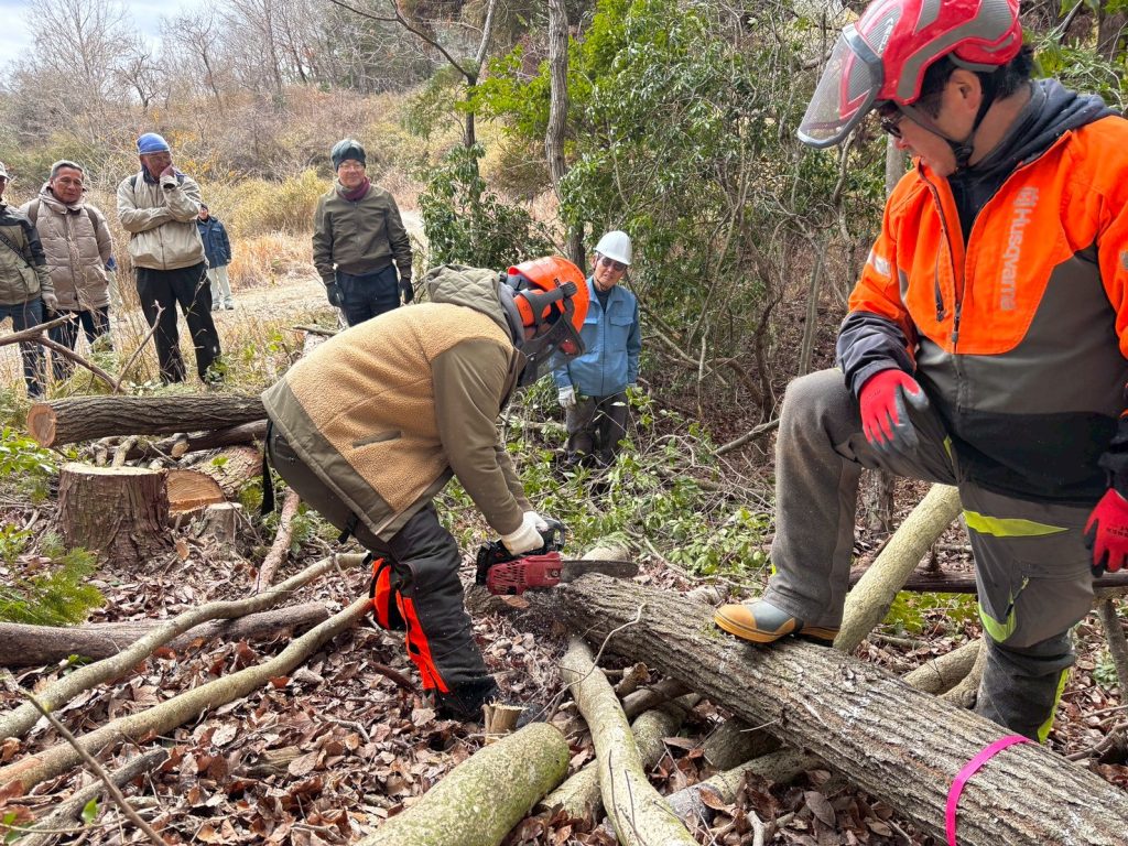 山存による森林整備ボランティア活動で、安全に木を玉切りするためのチェーンソー技術を学ぶのが主な目的でした。
